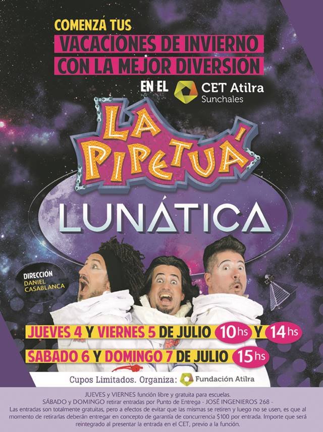 Sumando alternativas culturales para los niños y la familia, el Auditorio del Centro Educativo Tecnológico de Atilra será el ámbito en el cual se desarrollarán dos propuestas teatrales. De forma libre y gratuita se podrá disfrutar de la presencia de La Pipetuá Lunática y de «El Gran Truco».