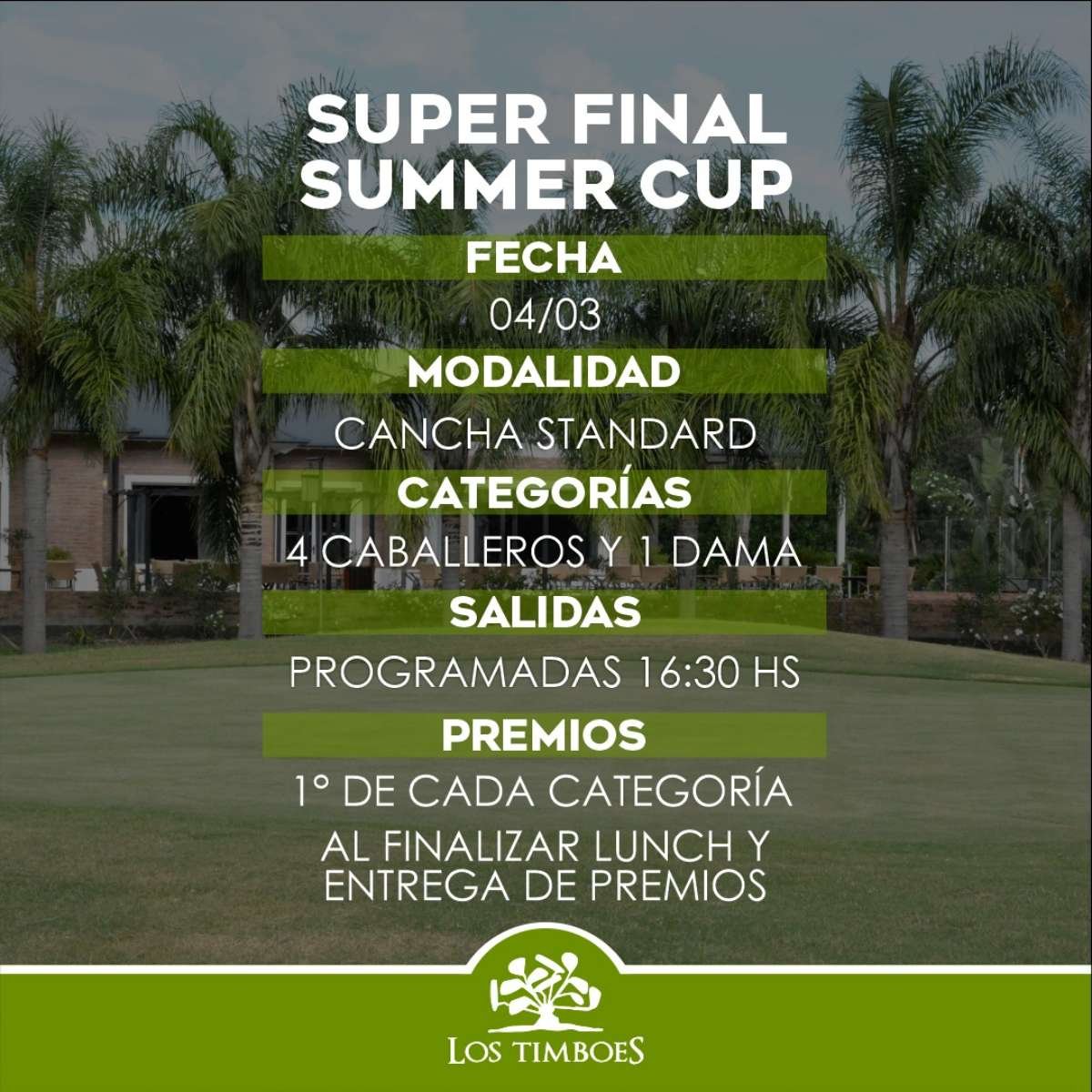 El primer torneo oficial del calendario 2023 de Los Timboes Campo de Golf se encamina hacia su culminación: el sábado 4 de marzo, bajo la modalidad Standard y luego de seis fechas, se disputará la Súper Final de la “Summer Cup 2023”.