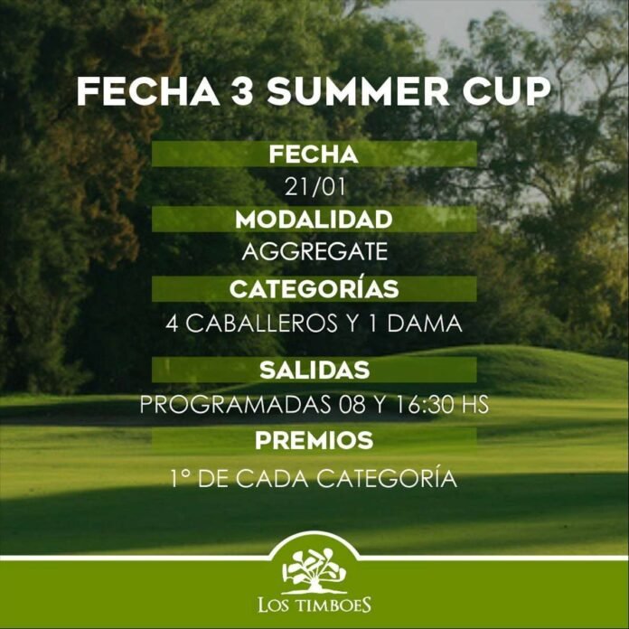 Desde el club de Golf «Los Timboes» informaron que el próximo sábado se estará disputando la Tercera Fecha de la tradicional Summer Cup. En esta oportunidad, la modalidad para su desarrollo será «aggregate», teniendo previsto la disputa de damas y caballeros.