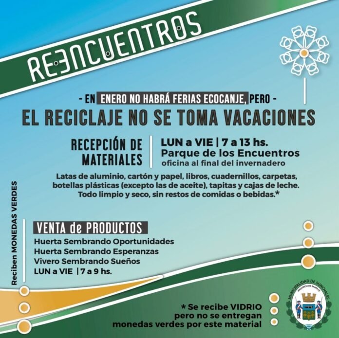 Sociedad Horarios de verano de la Feria Reencuentros 09/01/2023 Por Redacción SH 18 Compartir FacebookXWhatsAppEmail Desde el Municipio informaron cómo serán los horarios de verano para el funcionamiento de la Feria Reencuentros que seguirá, con otro formato, recibiendo aportes de elementos reciclables en el Parque de los Encuentros. TemasFeria Reencuentrosreciclaje Compartir FacebookXWhatsAppEmail Relacionadas Convocan a la segunda Feria Agroecológica 29/11/2022 Ultimas noticias Concejo: Nueva Sesión Ordinaria 15/04/2026 «Tacuarita» vuelve con una doble función en Casa de Steigleder 15/04/2026 Ices celebró sus cuatro décadas 14/04/2026
