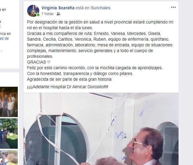 Sin dar detalles, ella misma se encargó de oficializar este movimiento a partir de un posteo que efectuó en su perfil de la red social Facebook, donde anticipó que: «por designación de la gestión en salud a nivel provincial estaré cumpliendo mi rol en el hospital hasta el día lunes».