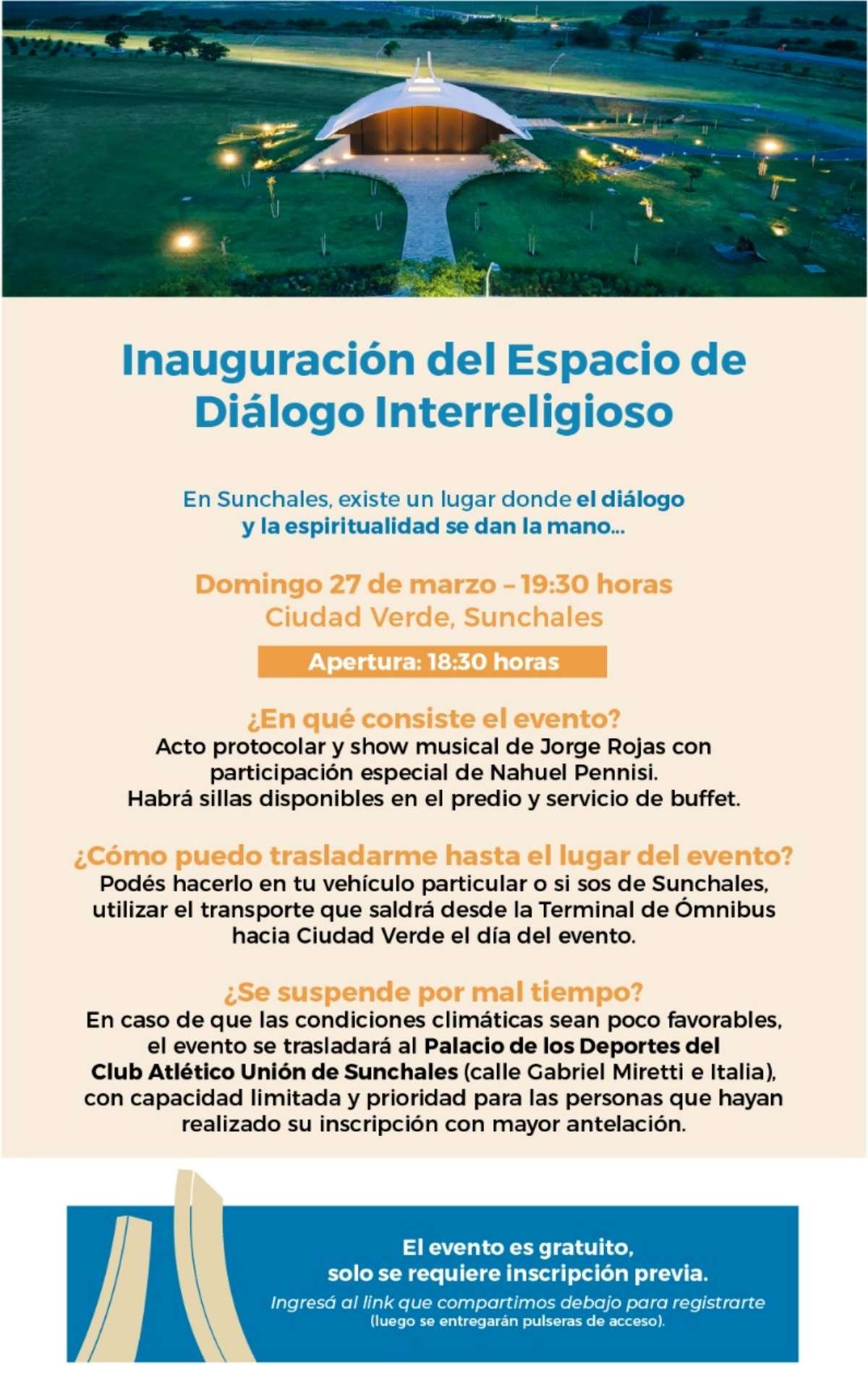 • ¿En qué consiste el evento?: inauguración del Espacio de Diálogo Interreligioso + show musical de Jorge Rojas con participación especial de Nahuel Pennisi.