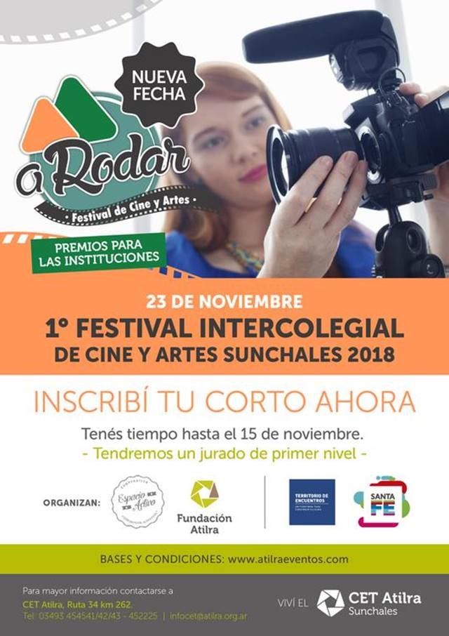 Fundación Atilra y la Cooperativa de Trabajo Espacio Activo conjuntamente con el Ministerio de Innovación y Cultura de la Provincia de Santa Fe, a través del programa Territorio de Encuentros, convocan a Entidades Educativas formal y no formal del ciclo medio de la región y la provincia, a través de sus docentes, jóvenes y adolescentes, a participar de la Primera Edición del Festival Intercolegial de Cine y Artes “A Rodar” 2018, que se llevará a cabo el 23 de noviembre, a las 19, en las instalaciones del Auditorio del Centro Educativo Tecnológico CET Atilra.