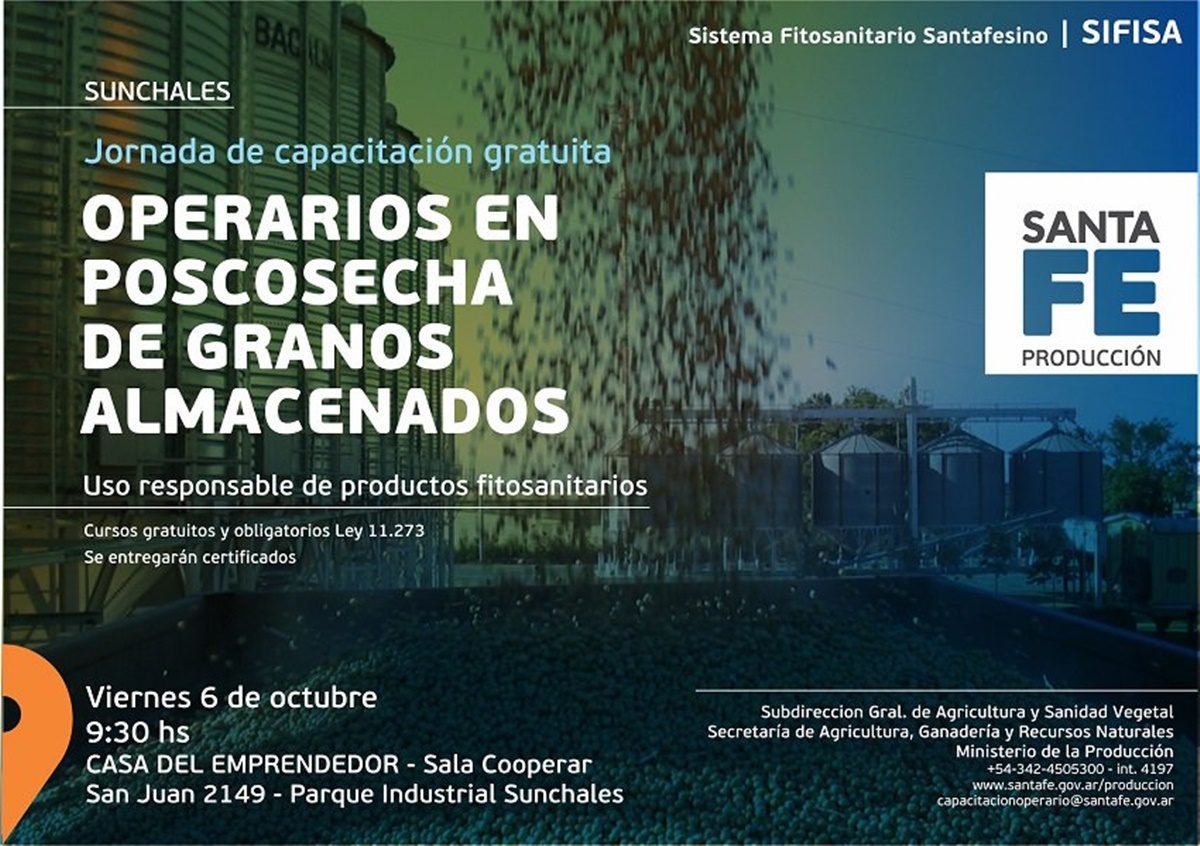 La Municipalidad de Sunchales invita a una charla denominada «Jornada de Capacitación de Operarios en Poscosecha de Granos Almacenados», que se realizará el viernes 6 de octubre, a las 9.30, en Casa del Emprendedor (San Juan 2.149, Área Municipal de Promoción Industrial).