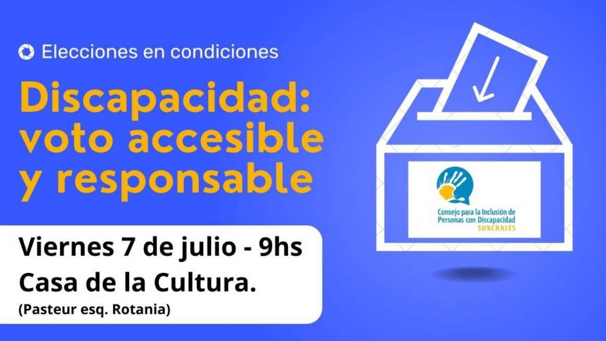 El Consejo para la Inclusión de Personas con Discapacidad de Sunchales invita a toda la comunidad a participar de la jornada “Discapacidad: voto accesible y responsable” a desarrollarse el viernes 7 de julio a partir de la hora 9 en la sala “Mónica Hoyos” de la Casa de la Historia y la Cultura del Bicentenario (Rotania esquina Pasteur).