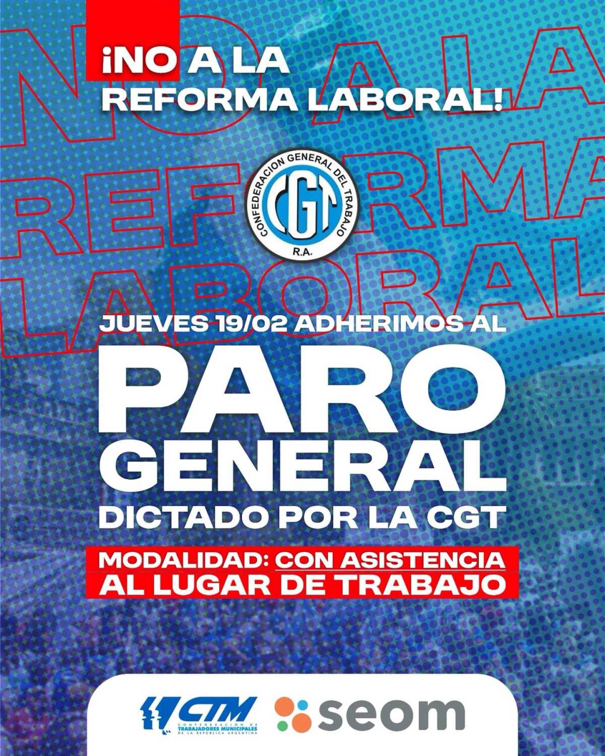 La Municipalidad de Sunchales informa a la comunidad que los sindicatos municipales Seom y Soem adherirán al paro general convocado por la CGT para este jueves 19 de febrero.