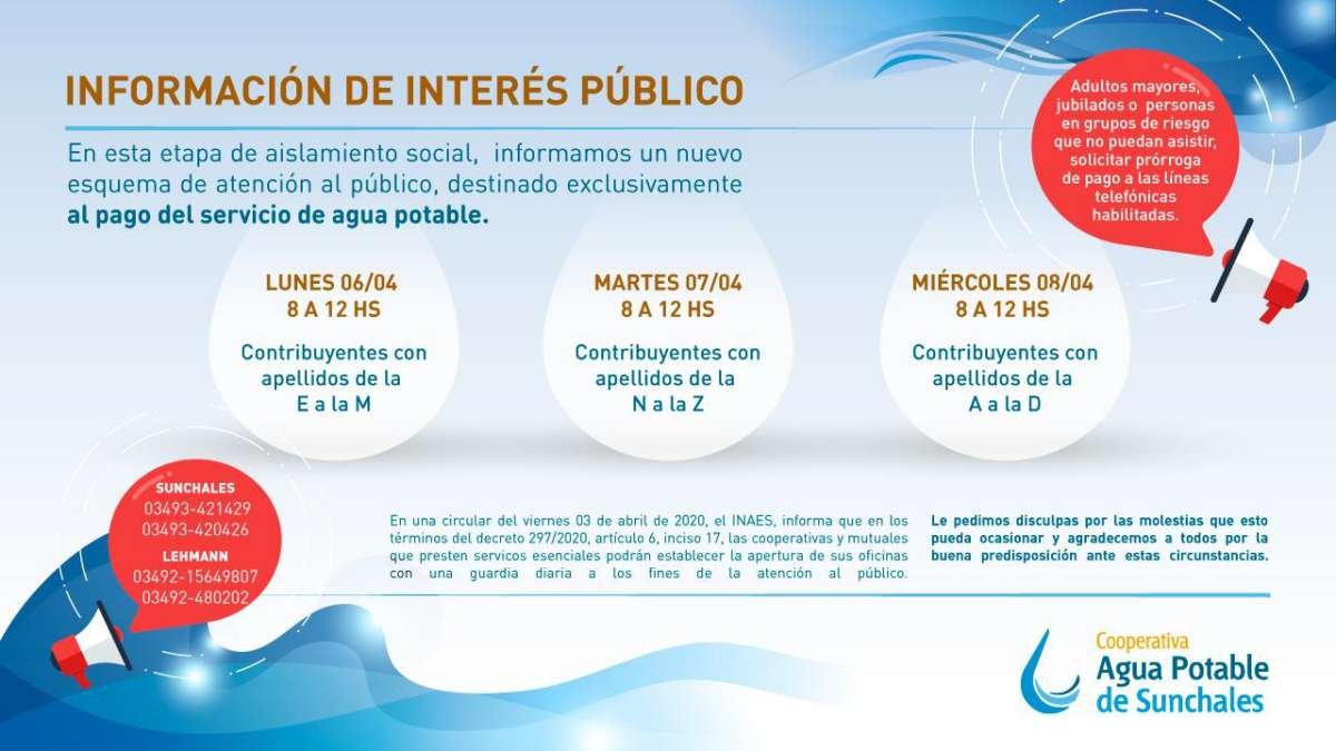 Como una forma de organizarse para respetar el aislamiento social impuesto, la Cooperativa de Agua Potable estableció un cronograma de pago para este lunes, martes y miércoles. A través del mismo se busca dar respuesta y opciones válidas a quienes no pueden disponer de alternativas electrónicas de cancelación. También insistieron en que adultos mayores, jubilados o personas en grupos de riesgo que no puedan asistir, deben solicitar prórroga de pago a las líneas telefónicas habilitadas.