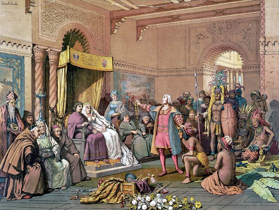 Colón como buen súbdito le entrega una muestra de su descubrimiento: oro, animales desconocidos como gallipavos, papagayos y conejos, el ají que obliga a la mala palabra, etc. Probaron las batatas, que son raíces dulces y se asombraron de que no conocieran el trigo. Además, Colón había preparado un jugoso botín para deslumbrarlos: pepitas, máscaras y coronas de oro, asegurándose así la franquicia de los soberanos. Los monarcas se mostraron maravillados por todo incluyendo la descripción que Colón hiciera del territorio, el que, según su Diario de Viajes semejaba el Edén.