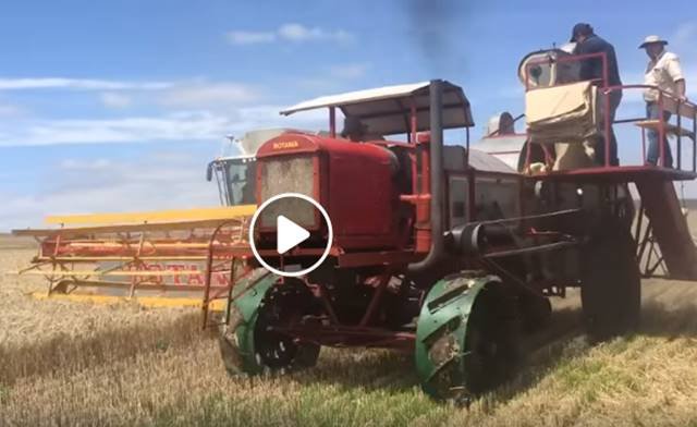 Haciendo lo mejor que sabe hacer, la mítica cosechadora Rotania, primera autopropulsada del mundo, fue exhibida por parte de Claas en acción en un campo de Balcarce.