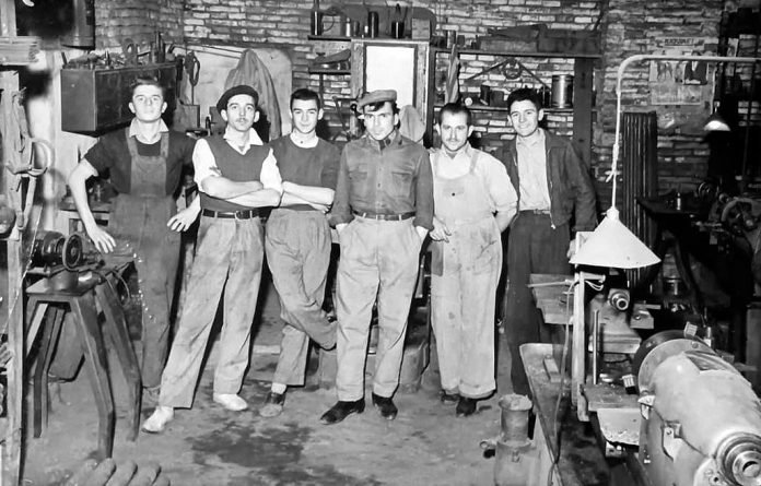 Jorge Rosso, Oscar Maretto, Miguel Angel Peirone, Líder Gasparotto, entre otros. Sección torneria de Alasia, aprox. año 1955 (Foto: Gentileza Héctor Rosso).