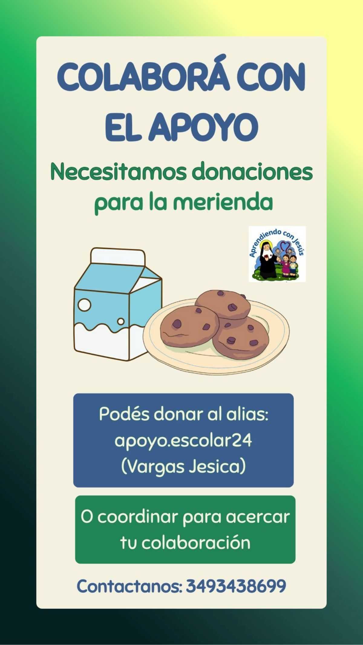 De cara al inicio de un nuevo ciclo lectivo, desde el apoyo escolar que funciona en el barrio Colón, llamado «Aprendiendo con Jesús», se solicita colaboración para lo que es el funcionamiento de la merienda.