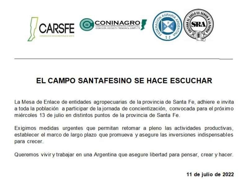 Además, esta medida, que incluye entre otras cosas protestas a la vera de las rutas (sin cortes) más un cese de comercialización (granos y hacienda) en reclamo al faltante de gasoil y presión impositiva, también tendrá la lectura de un comunicado en el cual se enumerarán las razones que motivaron el reclamo.