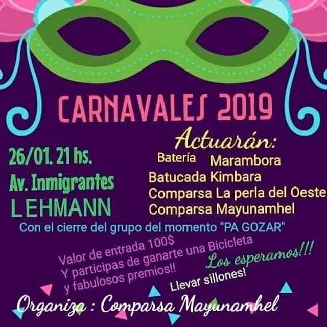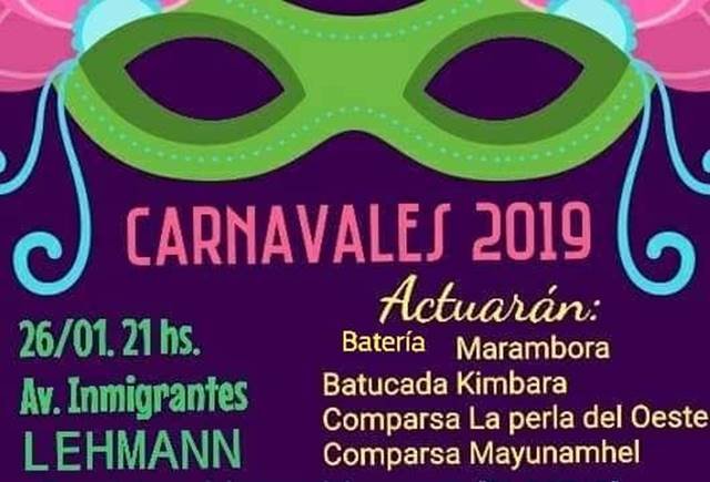 El próximo sábado 26 a partir de las 21 en el corsódromo de avenida Los Inmigrantes de nuestra localidad se llevará a cabo la Primera Noche de Carnavales Lehmenses 2019, bajo la organización de la Comparsa “Mayunamhel”.