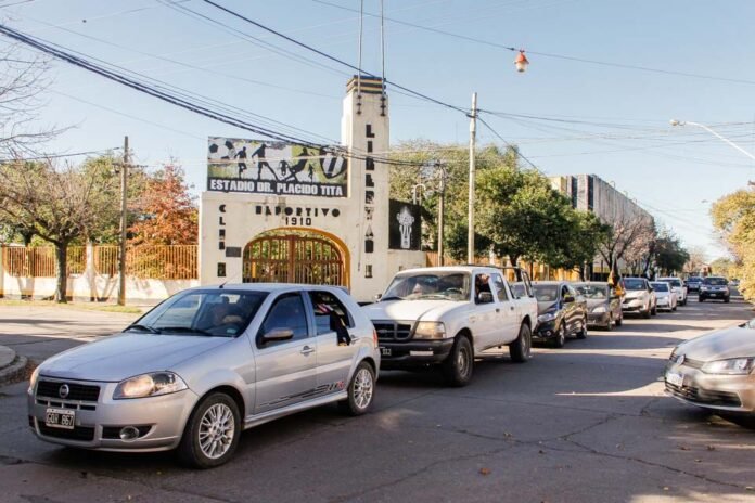 Aprovechando el sol y las buenas condiciones climáticas, los vehículos que habían partido de la sede institucional, llegaron hasta avenida Belgrano para derivar en calle 25 de mayo y bordear el sector noroeste de plaza Libertad, llegando a avenida Independencia para confluir nuevamente en la plaza, partiendo desde dicho sitio rumbo a avenida Yrigoyen. En el predio de Saltos Hípicos esperaba un sistema de sonido para que todos pudieran entonar las estrofas del Himno Nacional Argentino, la Marcha del club y luego sí, cerrar con la versión de «El Cañonero» que hace algunos años interpretó el grupo Los Palmeras.