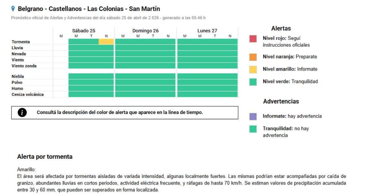 Interés general Lluvias y Alerta Amarillo para la noche 25/04/2026 Por Redacción SH 12 Compartir FacebookXWhatsAppEmail El Servicio Meteorológico Nacional anticipa inestabilidad para el resto del sábado, habiendo emitido un Alerta Amarillo ante posibles tormentas fuertes. TemaslluviaspronósticoSATtormentas Compartir FacebookXWhatsAppEmail Relacionadas El Municipio sale a recuperar calles de tierra y ripio 16/04/2026 SAT: Alerta Naranja para las próximas horas 14/04/2026 SAT: Otra semana con posibles tormentas fuertes 12/04/2026 Ultimas noticias PDI detuvo a una persona por microtráfico 25/04/2026 ARB – F6: Unión aplastó a Quilmes 25/04/2026 AMB – F7: Libertad superó a Centro Social de Brinkmann 25/04/2026