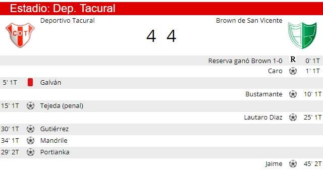 En el estadio «Hermanos Valler» del Deportivo Tacural, el local y Brown de San Vicente le dieron forma a un verdadero partidazo en la noche de ayer, en un cotejo válido por la Sexta Fecha del Torneo Apertura de la Liga Rafaelina de Fútbol.