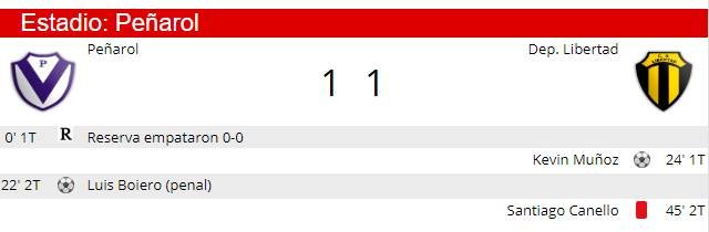En Rafaela, Peñarol y Libertad no se sacaron ventajas y terminaron igualados 1 a 1. La visita comenzó ganando a los 24′ del primer tiempo gracias a la conquista de Kevin Muñoz, mientras que la V Azulada llegó a la igualdad a los 22′ del complemento cuando Luis Boiero cambió penal por gol. Dirigió José Domínguez y en Reserva finalizaron sin goles.