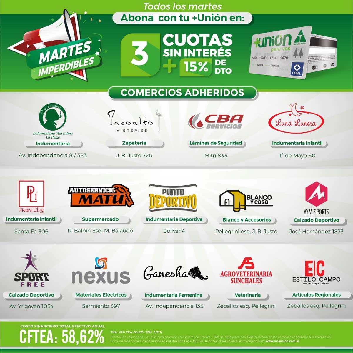 Seguimos incorporando más comercios a los Martes Imperdibles de tarjeta +Unión, la mejor manera de comprar y sumar beneficios.