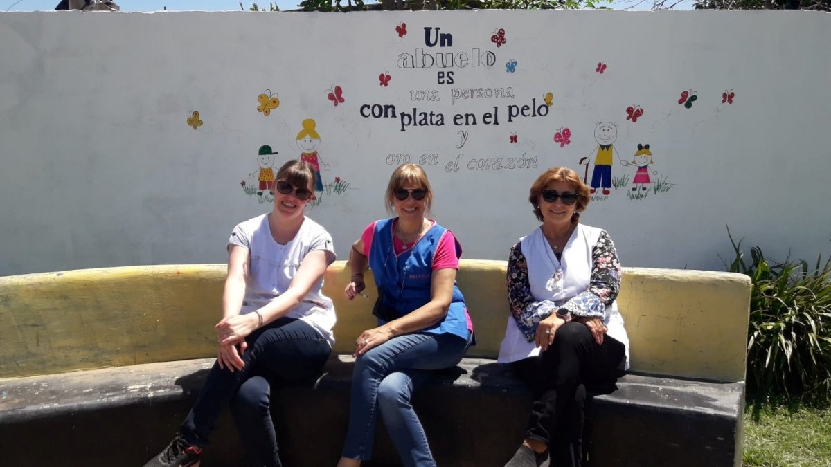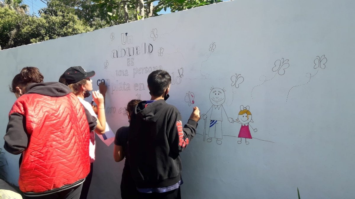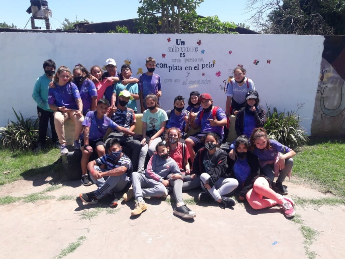 Los alumnos de Séptimo Grado de la escuela Nº 6388 «Juan B.V. Mitri», quienes apadrinan la Plaza «De los Abuelos» de nuestro barrio, en la semana anterior estuvieron presentes en la misma para realizar nuevas pinturas en su tapial.