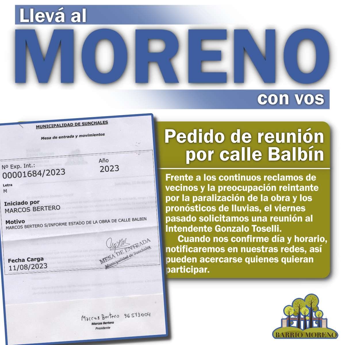 Moreno: Piden reunión con Toselli por calle Balbín