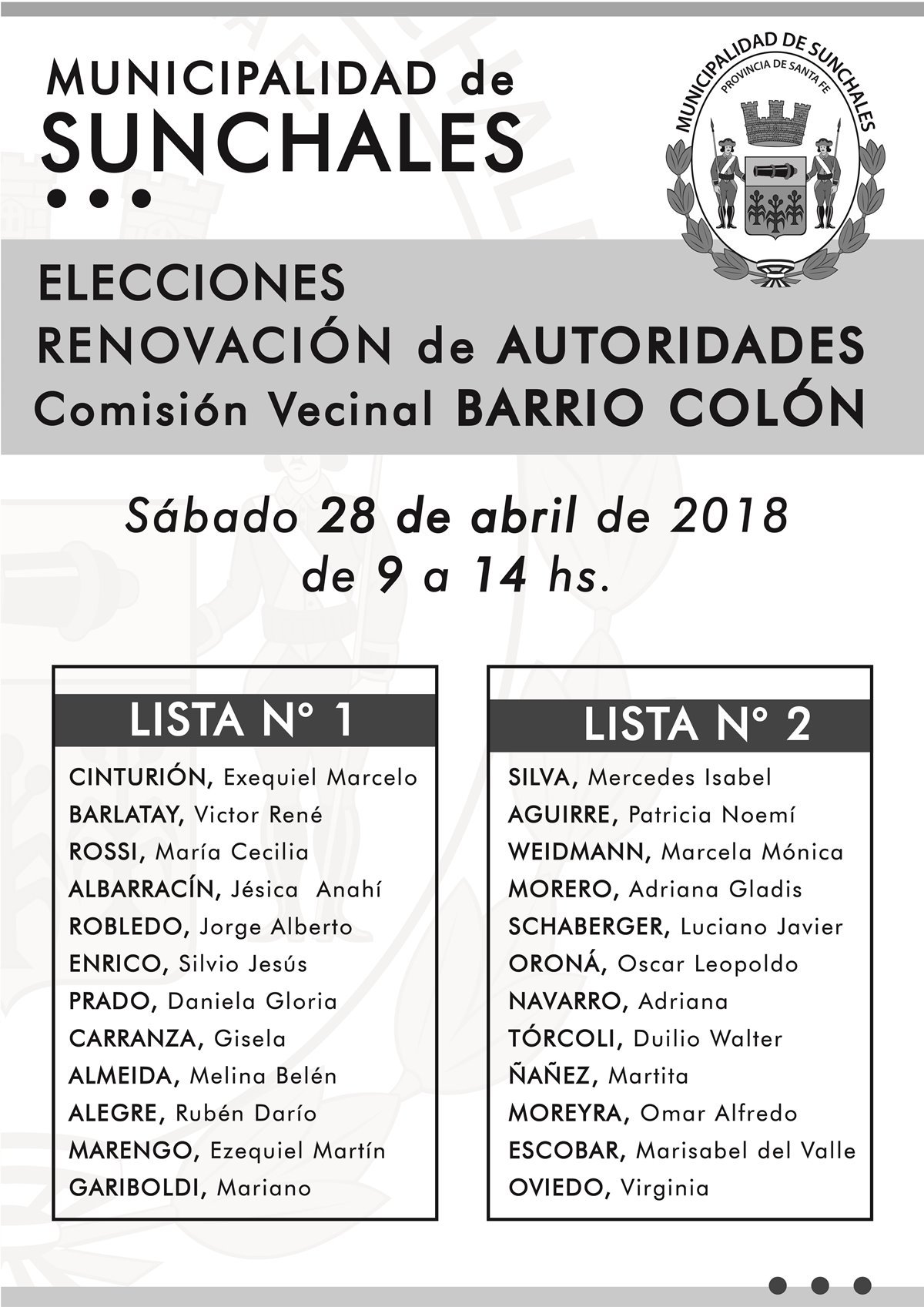 La Municipalidad de Sunchales convoca a elecciones para renovar las autoridades de las comisiones vecinales de los siguientes barrios: Colón y Moreno.