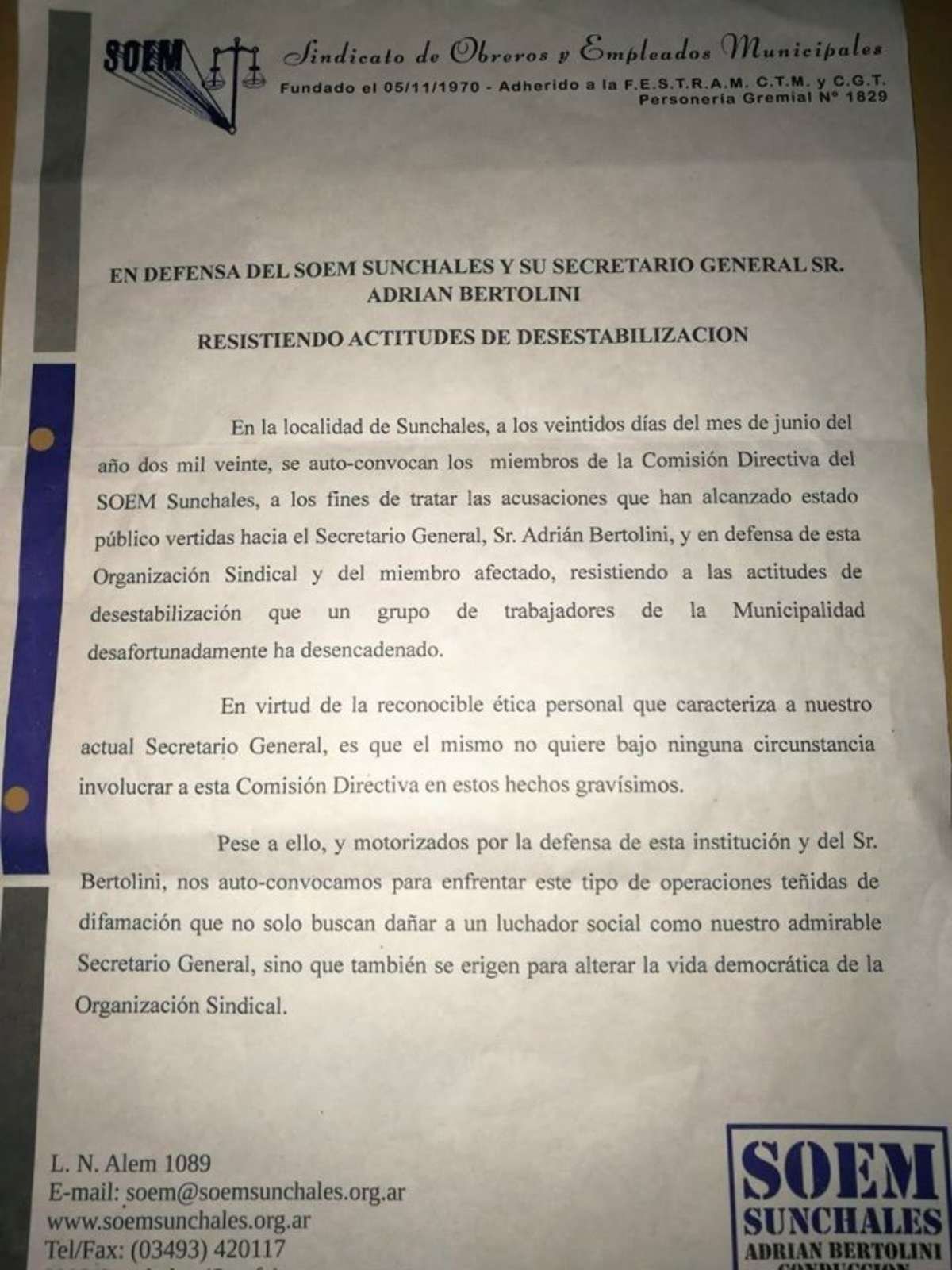 A mitad de semana se conoció un texto de respaldo de la Federación de Sindicatos de Trabajadores Municipales de la Provincia y ahora trascendió esta nueva muestra de respaldo hacia Bertolini.