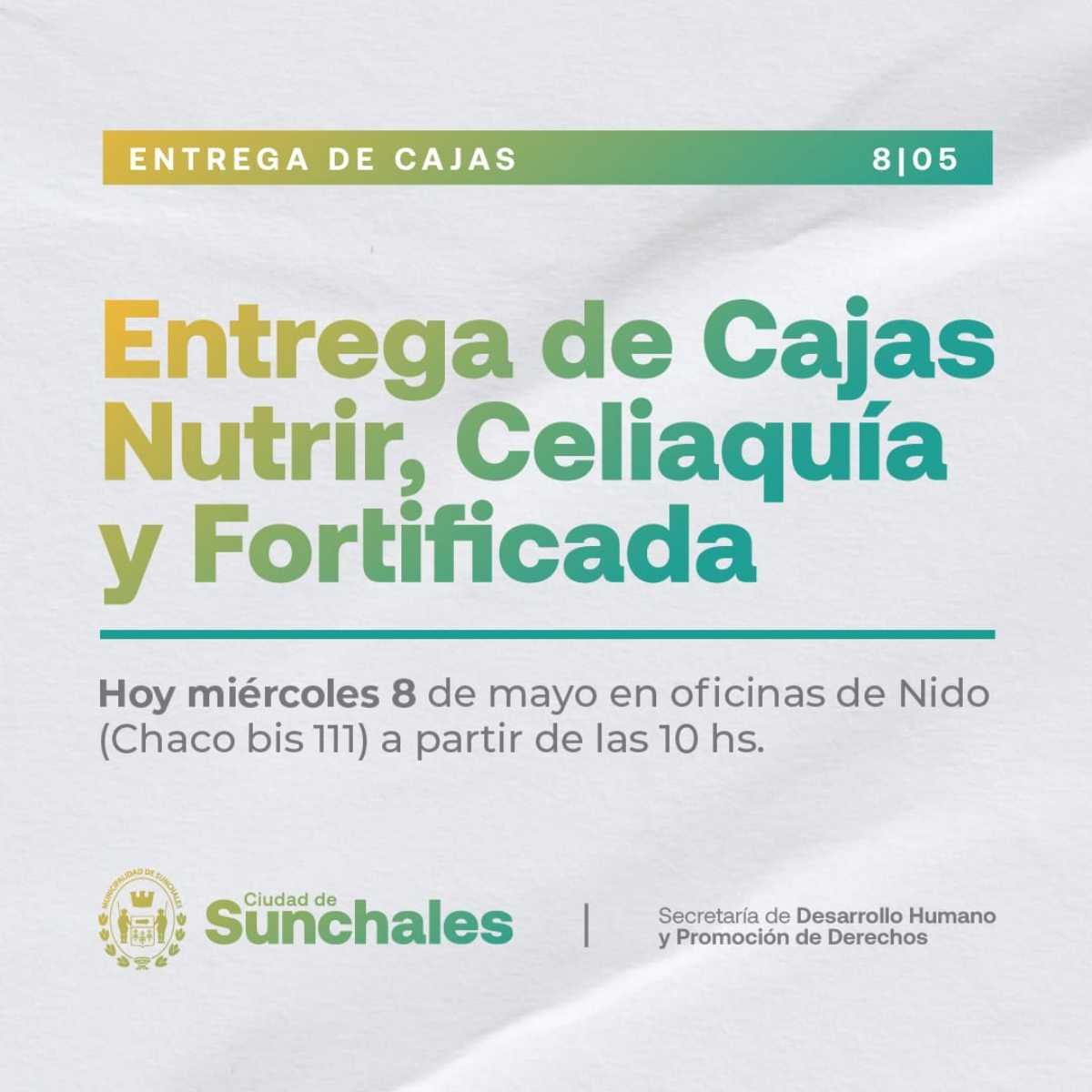 El Municipio informó que desde las 10, se entregarán las Cajas Nutrir, Celiaquía y Fortificadas, en el Nido de Barrio Cooperativo.