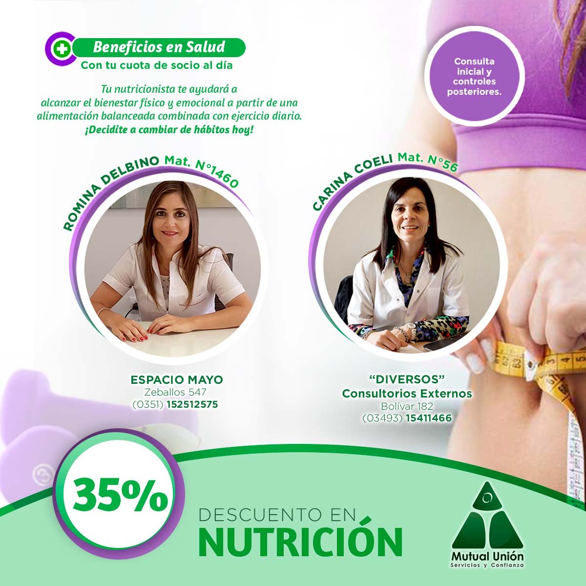 Dentro de los beneficios en salud de Mutual Unión, destacamos el servicio de nutrición, que brinda a los asociados 35% de descuento en consulta, tratamientos con entrega de plan alimentario y controles.