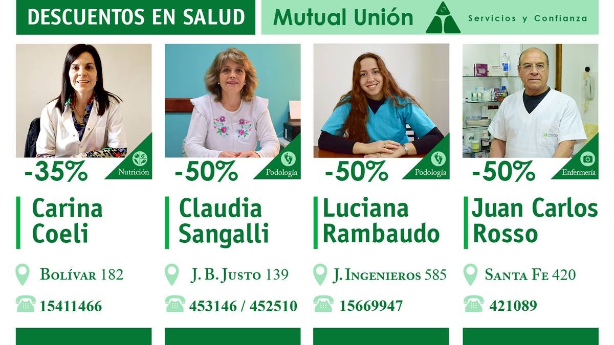 Todos los Asociados de Mutual Unión pueden disponer de estos descuentos y de otros importantes beneficios en salud como: Descuentos en Medicamentos, Análisis Bioquímicos, Odontología, Servicio de Ortopedia y Banco Solidario de Sangre.