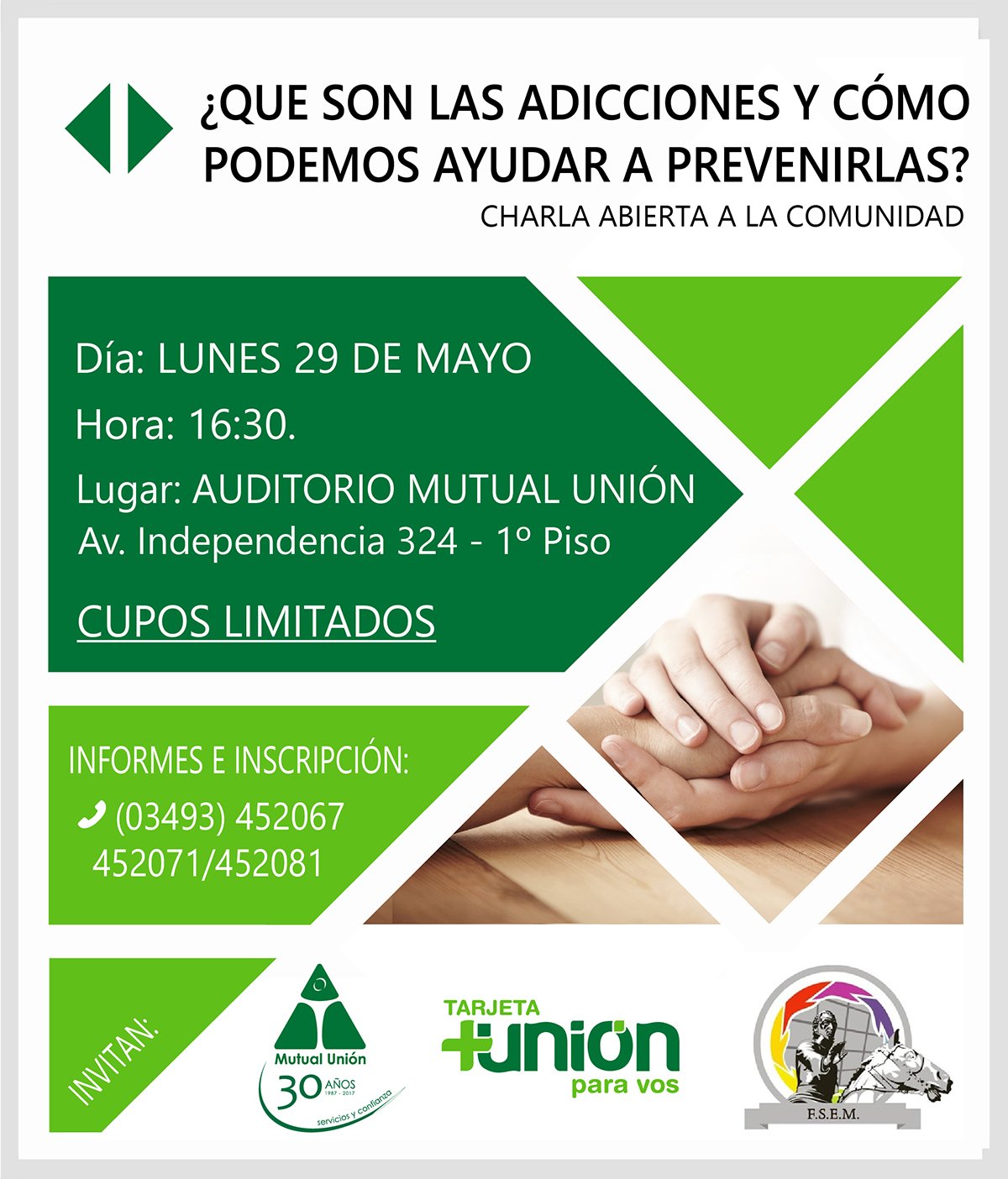 Comprometida con la comunidad y en el marco de las acciones previstas con motivo de sus 30 años, la Asociación Mutual del club Atlético Unión, junto a la Federación Santafesina de Entidades Mutualistas «Brigadier Gral. E. López» invitan a la charla que abordará la problemática de las adicciones.