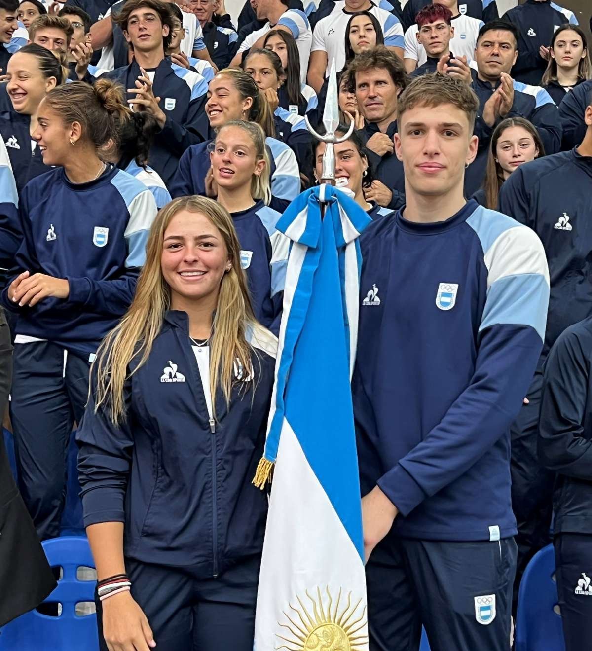Durante la ceremonia, recibieron la bandera argentina la tenista Luciana Moyano (16 años, de Marcos Juárez, Córdoba) y el jugador del seleccionado argentino de básquetbol 3×3 Nicolás Chiaraviglio (18 años, de Sunchales, Santa Fe).