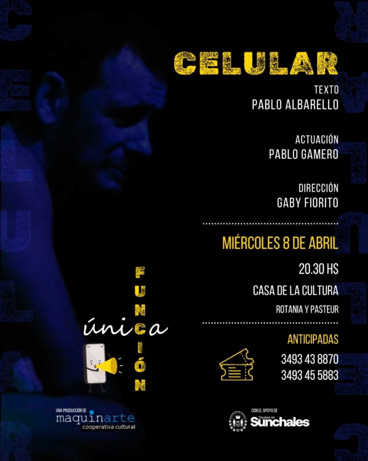 En lo que será una única función, esta noche se repondrá la obra «Celular», interpretada por Pablo Gamero.