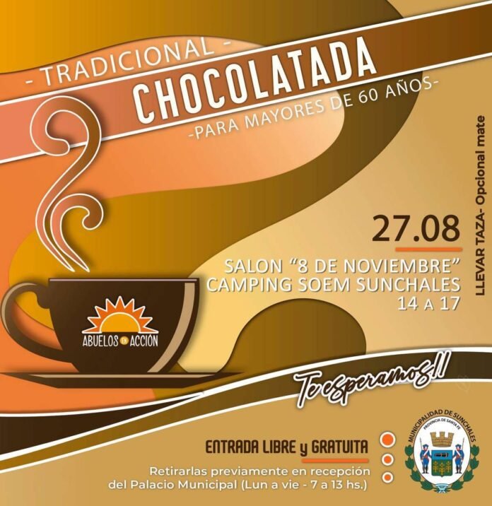 Desde el Municipio informaron que el próximo domingo 27 en el salón «8 de Noviembre» del predio del Soem, entre las 14 y las 17, se realizará una nueva edición de la tradicional Chocolatada para Abuelos.