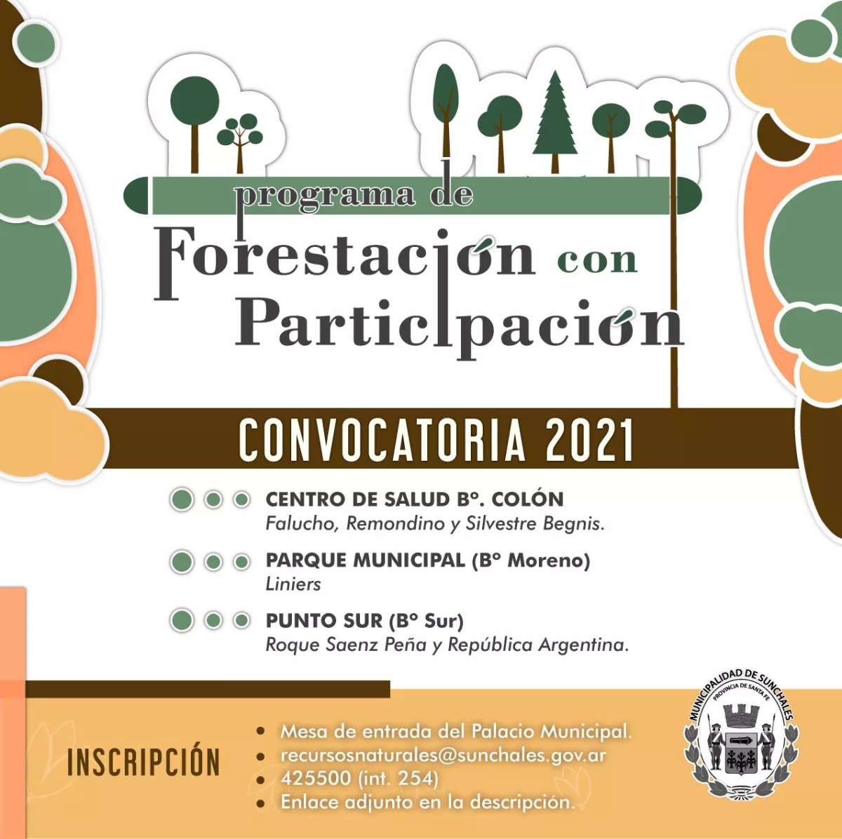 La Municipalidad informa que se abren las inscripciones para una nueva edición del programa Forestación con Participación, que promueve la plantación orientada de árboles en los espacios verdes públicos disponibles en la ciudad, a través de la cooperación de la comunidad, en función de lo reglamentado por la Ordenanza Municipal Nº 1530/2004.