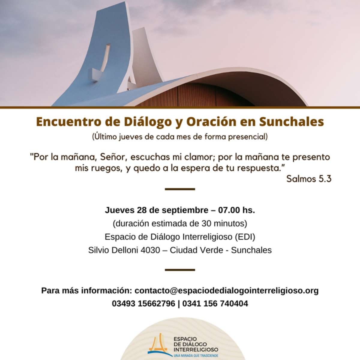 Desde el Espacio de Diálogo Interreligioso se informó que este jueves 28, a las 7 de la mañana, se repetirá la iniciativa que se lleva adelante cada último jueves de mes. Se trata de la posibilidad de acercarse al lugar y poder compartir un tiempo de oración y reflexión.