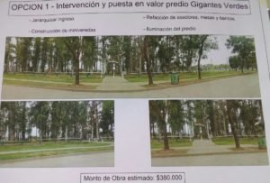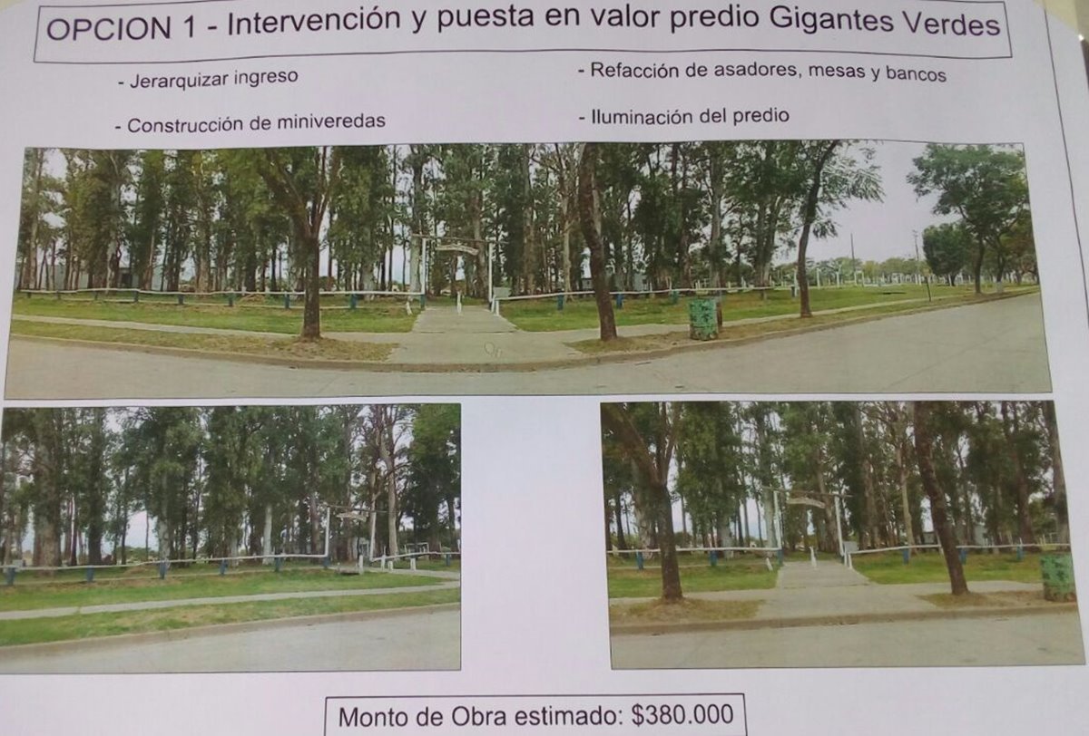 La opción más respaldada por los vecinos fue la que incluye la realización de tareas de mejoras en el predio de «Los Gigantes Verdes», incluyendo una renovada portada de acceso, sendas peatonales internas y recuperación del mobiliario existente, junto a iluminación con tendido de cables subterráneo.