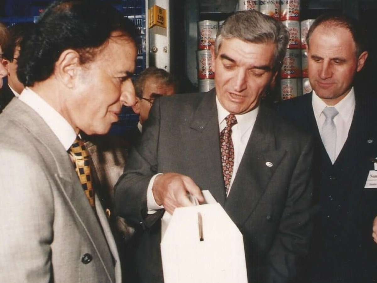 Walter Toldo, responsable de SanCor, le entrega productos de la cooperativa al por entonces Presidente Carlos Menem. Detrás, Danilo Graziutti, compartiendo el acto.