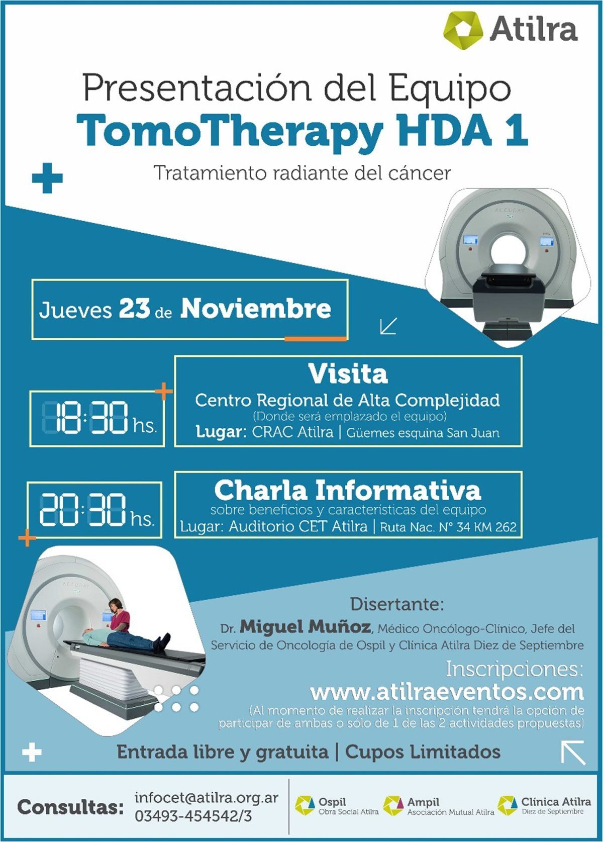 Con inversiones de decenas de millones de pesos, no solamente la estructura será de vanguardia sino como se anticipó desde un principio, la tecnología que incorpore. Este es el caso del tomógrafo -Tomo Therapi HDA1- que ha sido adquirido y será presentado por parte del Jefe del Servicio de Oncología de Ospil y Clínica Atilra Diez de Setiembre mañana.