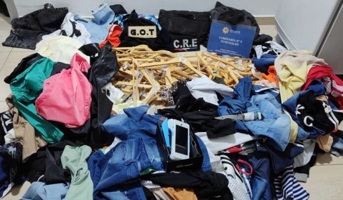 Los uniformados realizaron saturación y en calle Lisando de la Torre y 25 de mayo personal del GOT y de Comando procedieron a la Aprehensión de una mujer mayor de edad, dos hombres y al resguardo de una menor, continuaron con el rastrillaje pedestre y en un pastizal hallaron varias perchas, dos mochilas y una bolsa de consorcio con prendas de vestir varias, procedieron al formal secuestro de las mismas.