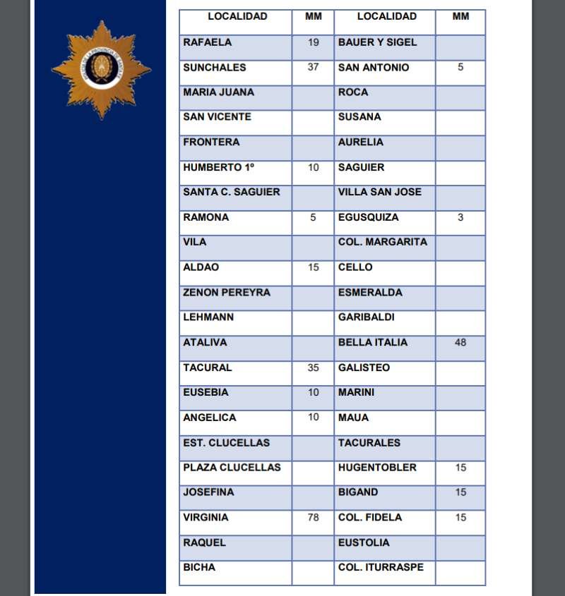 Mediante un informe especial, el área de Relaciones Institucionales de la Unidad Regional V de Policía difundió los registros de precipitaciones que se fueron recolectando en las localidades del Departamento en el transcurso de las últimas horas.