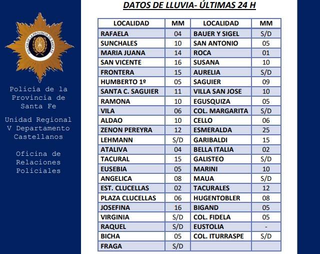 Compartimos el relevamiento realizado por parte del área de Relaciones Institucionales de la Unidad Regional V de Policía con el registro de precipitaciones de las últimas 24 horas.