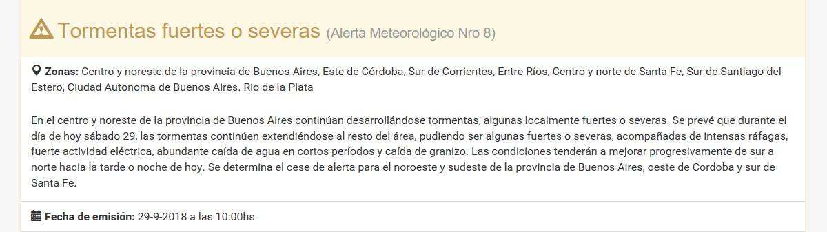 Comprende centro y noreste de la provincia de Buenos Aires, Este de Córdoba, Sur de Corrientes, Entre Ríos, Centro y norte de Santa Fe, Sur de Santiago del Estero, Ciudad Autonoma de Buenos Aires. Rio de la Plata. Pronostican que algunas pueden localmente fuertes o severas, acompañadas de intensas ráfagas, fuerte actividad eléctrica, abundante caída de agua en cortos períodos y caída de granizo.