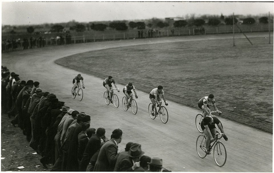 Carrera de ciclistas con los ases extranjeros. Se distinguen los señores: Loatti, Fabré (local), M. Abregú, Di Paco y Bértola. 12 de agosto de 1940. (Museo y Archivo Histórico Municipal)
