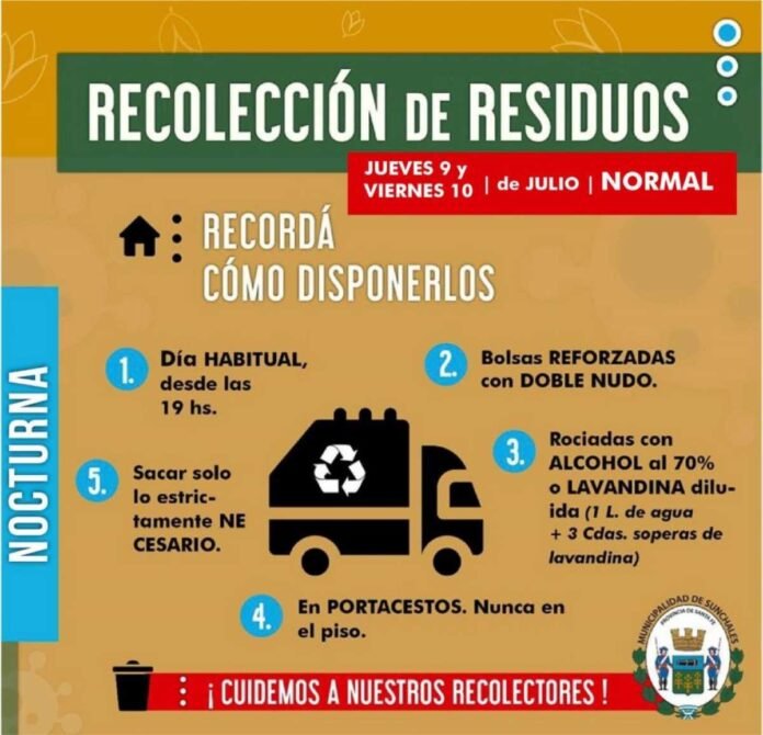 El Municipio informó que el jueves 9, Feriado en conmemoración al Día de Independencia Argentina y viernes 10, se realizará con normalidad, el habitual servicio de recolección nocturna de residuos.