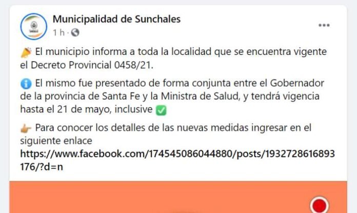 A más de 48 horas de conocido el Decreto Provincial Nº 458/21 y tras una jornada cargada de tensión y reuniones, el Municipio dio a conocer que la ciudad se adhiere a la normativa. Así de simple, una limitada publicación en Facebook y el mismo comunicado vía Whatsapp.