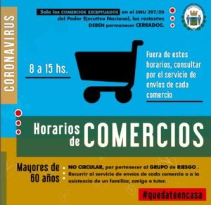 > Para Comercios: Exceptuados en el DNU 297/20 del Poder Ejecutivo Nacional, que sean considerados como Actividades Esenciales (supermercados mayoristas y minoristas y comercios minoristas de proximidad, además de ferreterías, veterinarias y provisión de garrafas): el horario de atención será de 8 a 15.