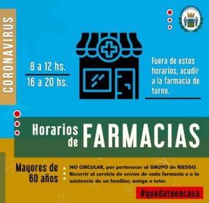 > Farmacias: podrán permanecer abiertas en el horario habitual de 8 a 12 y de 16 a 20, de lunes a viernes. Fuera de esta franja horaria, brindará servicio la farmacia de turno.