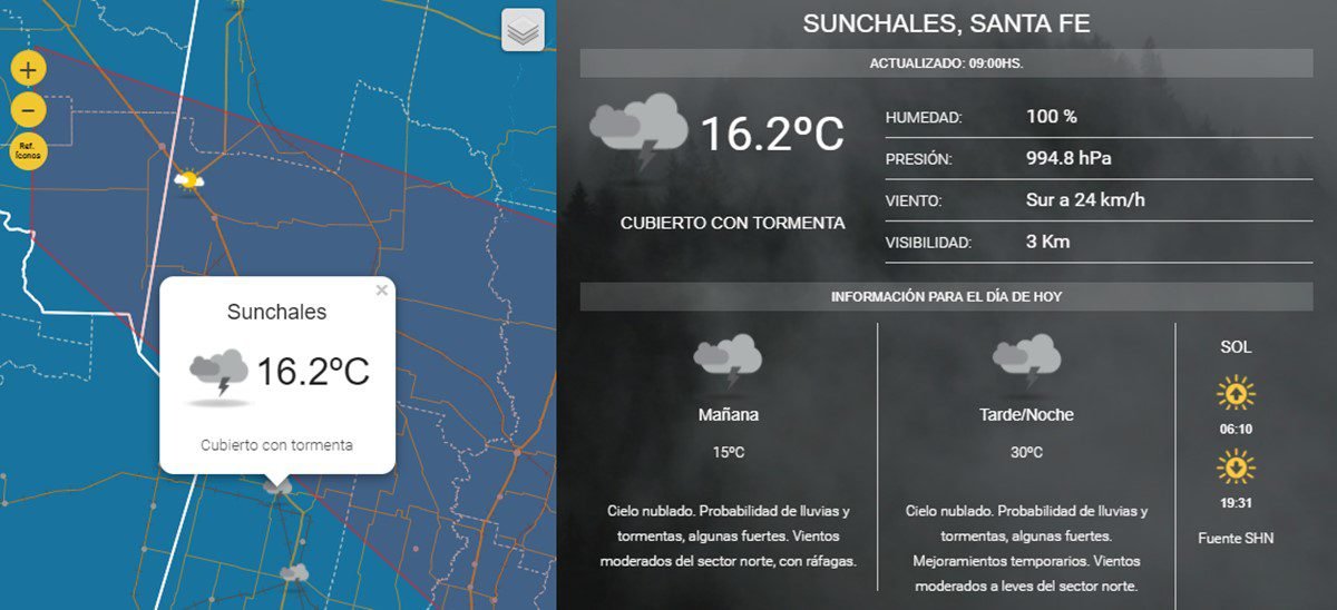El Servicio Meteorológico Nacional mantiene vigente el alerta por tormentas de variada intensidad para el centro y sur de la provincia de Santa Fe. El informe dice: “Se espera que estas se intensifiquen y generalicen, pudiendo ser algunas localmente fuertes, estar acompañadas por abundante caída de agua, ráfagas, fuerte actividad eléctrica y caída de granizo”.