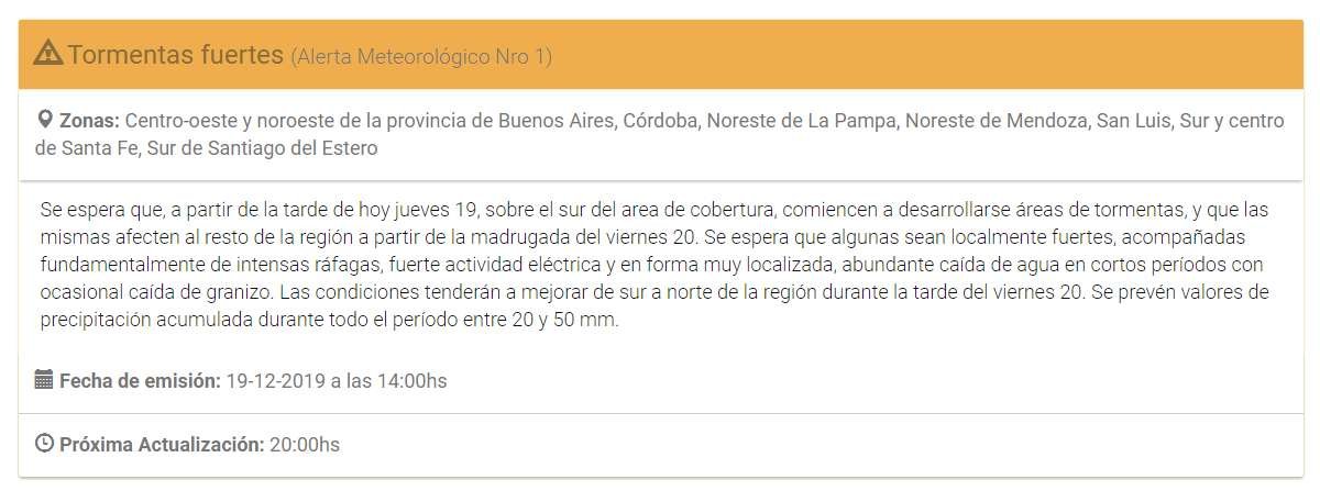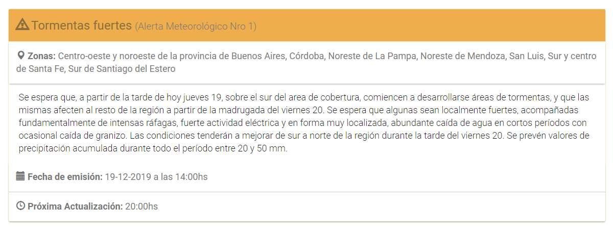 Según el informe, se espera que a partir de las 19 horas del jueves comiencen a desarrollarse áreas de tormentas sobre La Pampa y Buenos Aires y que las mismas afecten al resto de la región -incluyendo a Santa Fe- a partir de la madrugada del viernes 20.