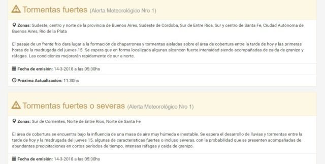 Se espera el desarrollo de lluvias y tormentas entre la tarde de este miércoles y la madrugada del jueves, algunas de características fuertes o incluso severas, con la probabilidad que se presenten acompañadas de abundantes precipitaciones en cortos períodos de tiempo, intensas ráfagas y caída de granizo.